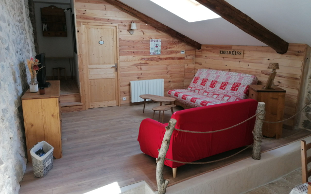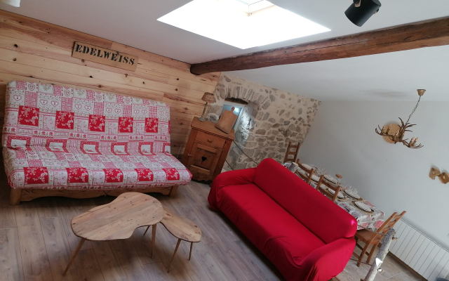 L’EDELWEISS : Appartement pour 6 personnes composé d’une pièce de vie lumineuse avec un coin cuisine, d’une salle de bains avec une douche double, d’un wc et de 3 chambres (2 avec un lit double et une avec deux lits simples). Label Gîte de France 3 étoiles et location toute l’année.